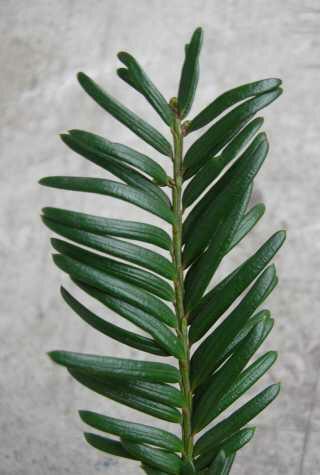 Igły spłaszczone, lekko wygięte i zaostrzone, z cienkim i krótkim ogonkiem u nasady. Górna strona ciemnozielona, błyszcząca, z wypukłym nerwem. Dolna strona jaśniejsza, żółtawa.